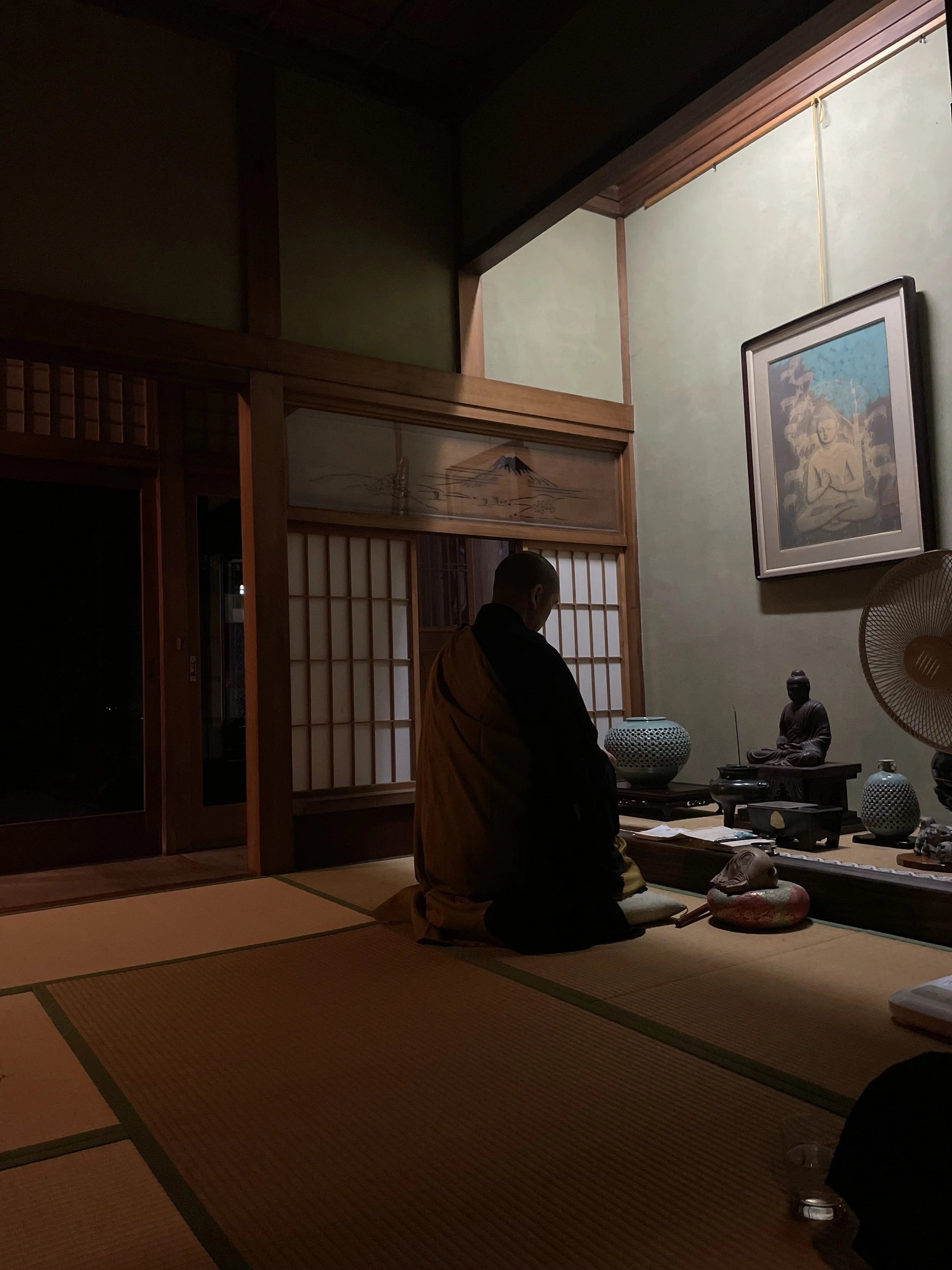 Image shows Priest Keno Miura chanting for our loved ones at Dairyuji Temple in Oga, Akita. Lighthouse is an entirely secular space, borrowing from many ways to deal with death and loss, across religion, culture and academia. Keno chants for the people we have lost every month on their special day.